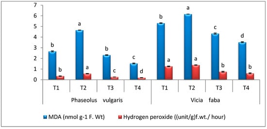 Effect of A. terreus on the contents of MDA and H2O2 of Rhizoctonia solani-infected (P. vulgaris & V. faba) plants. T1 = Healthy control; T2 = Infected control; T3 = Healthy with A. terreus, and T4 = Infected with A. terreus. Data are presented as means ± SD (n = 3). Data are from the LSD test at p ≤ 0.05. (a, b, c and d: symbols of significance letters).