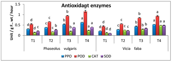 Effect of A. terreus on the activities of polyphenol oxidase (PPO), peroxidase (POD), catalase (CAT), and superoxide dismutase (SOD) of Rhizoctonia solani-infected P. vulgaris and V. faba seedlings. T1 = Healthy control; T2 = Infected control; T3 = Healthy with A. terreus, and T4 = Infected with A. terreus. Data are presented as means ± SD (n = 3). Data are from the LSD test at p ≤ 0.05. (a, b, c and d: symbols of significance letters).