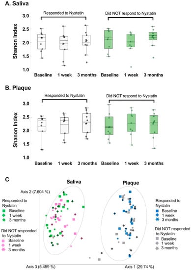 The alpha diversity of the oral microbiome in samples collected from participants who responded to the Nystatin rinse remained stable over the course of the study period. This is evident in Figure 1A,B, where the p-values were all greater than 0.05. Specifically, the p-values at week 1 were 0.39 and 0.76 for the saliva and plaque samples, respectively, and the samples collected at three months had p-values of 0.87 for both groups.