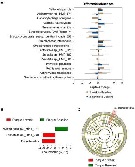 The linear discriminant analysis (LDA) effect size (LEfSe) method, as shown in Figure 2B, further supports these findings by indicating that Actinomyces sp._HMT 171 was more abundant at the baseline compared to week 1. Additionally, Prevotella sp._HMT 300 and Eubacteriales were found to be more abundant at week 1. It is noteworthy that both methods identify Actinomyces sp._HMT 171 and Prevotella sp._HMT 300 as species that showed a significant difference between the baseline and week 1.