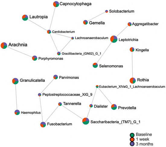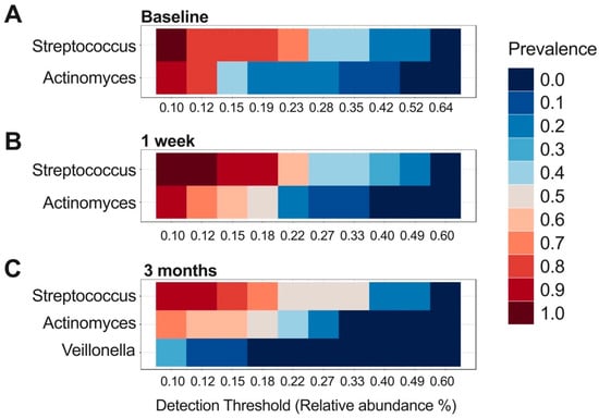 From the baseline to week 1, the core taxa at the genus level, characterized by a prevalence above 20% and a relative abundance greater than 1%, were Streptococcus and Actinomyces. The core microbiome remained unchanged, as evidenced in Figure 3A,B. However, three months post-baseline, Veillonella emerged as a new core genus alongside Streptococcus and Actinomyces (Figure 3C).