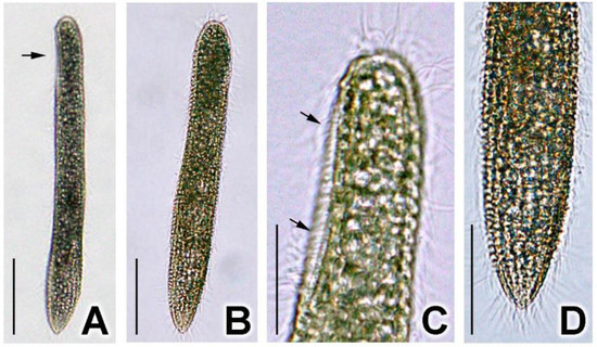 Photomicrographs of Geleia sp. YT from living cell with the light microscope. (A) Lateral view. Typical individual showing straight shape while gliding on the substrate. Buccal field is located at the anterior end (arrows); (B) Dorsal view. Typical individual showing straight shape while gliding on the substrate. (C) Detail of anterior end, lateral view. Arrow marks the buccal field. (D) Detail of posterior end, dorsal view. Scale bars = 25 μm (A,B); 10 μm (C,D).