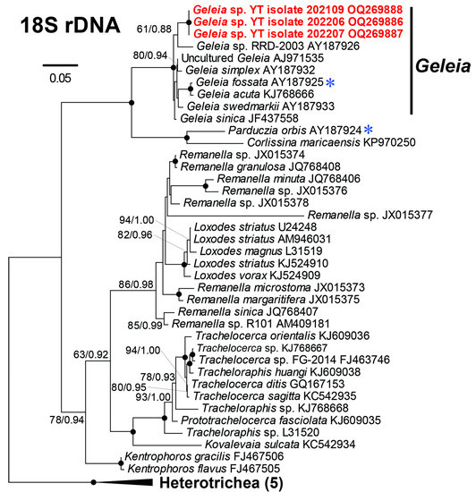The 18S rRNA sequences acquired from the three isolates of Geleia sp. YT (designated as isolates 2021-09, 2022-06, and 2022-07) were found to be identical both within the isolate (among clones) and across different isolates. One representative clone sequence from each isolate was used in the subsequent phylogenetic analysis. The sequences were deposited in GenBank under the accession numbers OQ269886–OQ269888. The acquired 18S rRNA gene of Geleia sp. YT was 1446 bp long and had a GC content of 50.90%. A blastN search against the NCBI database showed the sequence shared the highest identity (98.5%) with Geleia sinica (JF437558) but differed in 24 bases from the latter. In the phylogenetic trees, Geleia sp. YT fell into the monophyletic clade of genus Geleia with full support but showed no strong affiliations to the known species within the genus (Figure 2).
