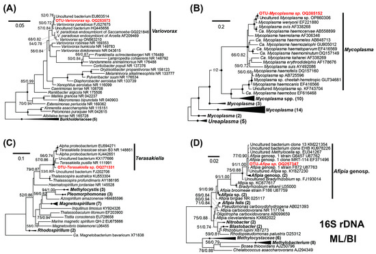 In the phylogenetic trees, the OTU Variovorax sp. fell into the clade of the genus Variovorax, clustering with other V. paradoxus strains (Figure 5A). The sequence of the OTU Variovorax sp. was highly similar to an environmental sequence (EU803514) and a Variovorax paradoxus (FJ527675) representing a symbiotic bacterial strain isolated from a root nodule of a legume host (Table 2). The 16S rRNA gene of OTU Mycoplasma sp. was affiliated with other Mycoplasma sequences in the phylum Tenericutes (Figure 5B). The OTU robustly clustered with an uncultured Mycoplasma species (OP860306) and the species M. wenyonii (Figure 5B), differing by 3 and 5 bases, respectively. The OTU Terasakiella sp. and OTU Afipia sp. fell into monophyletic clades of the genera Terasakiella and Afipia (Figure 5C,D). The OTU Terasakiella sp. did not show a close affiliation to any known species; its 16S rDNA sequence is most similar to an uncultured bacterium collected in a sea oil reservoir (EU594271), but the two differ by 32 bases (Table 2). The OTU Afipia sp. fell into a clade comprised of mainly unnamed genospecies, which were divergent from the named species (Figure 5D).
