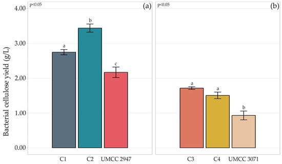Quantification of BC (g/L) produced by strains UMCC 2947 (a) and UMCC 3071 (b) in monoculture and in combination with LAB. Bar plots indicate the average BC by three replicates ± standard deviation. Significant differences among BC yields are shown by different letters (p ≤ 0.05).