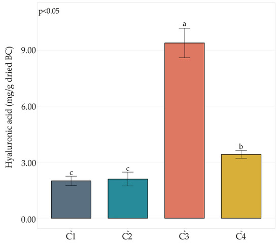 HA content (Figure 2) in C1 and C2 composites resulted in 2.00 and 2.10 mg HA/g dried BC, respectively. The HA content in the C4 composite was moderately higher, resulting in 3.42 mg/g dried BC. The highest HA content was detected in the C3 combination, reaching almost 10 mg/g dried BC.