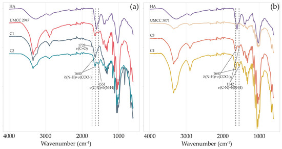 All BC-HA composite spectra, excluding C1, showed an intense peak of secondary amide N-H bending and C-N stretching at around 1550 cm−1 [45]. On the other hand, only in C1, we observed a peak at 1728 cm−1, which was absent even in HA or pure BC spectra. Finally, for all BC-HA samples, a strong vibrational band at around 1640 cm−1 (N-H bending amide II and COO- asymmetric stretching) is clearly visible.