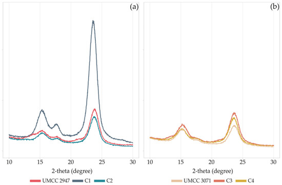 The CI slightly varied for combinations (C1 and C2) involving UMCC 3071 as BC producer (Table 3), ranging between 73 and 76%. On the other hand, the crystallinity of BC produced by UMCC 2947 was mainly affected when produced in co-culture, decreasing from 88% to 84% and 80% when produced by UMCC 2535 and UMCC 2496, respectively. Generally, co-culture systems and HA presence lead to a decrease in CI in all BC-HA samples.