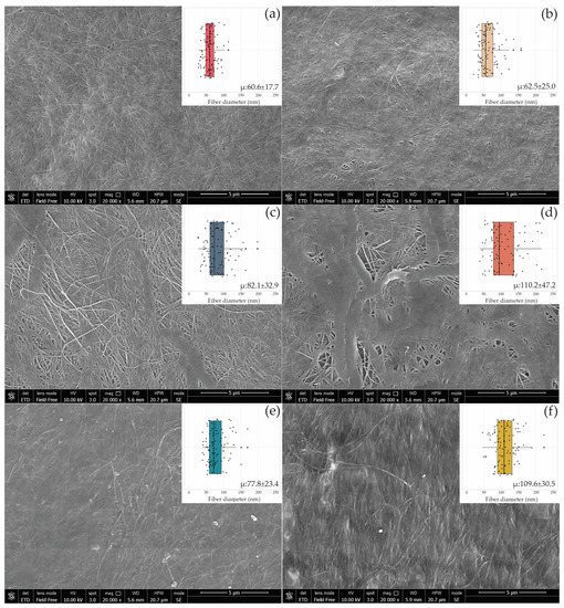 SEM images of the BC surface produced by UMCC 2947 (a), UMCC 3071 (b), and BC-HA composites C1 (c), C2 (e), C3 (d), and C4 (f). The boxplot in the inserts shows the fiber diameter distribution in each sample synthesized in monoculture (a,b) and co-culture with UMCC 2535 (c,d) and UMCC 2496 (e,f). “μ” indicates the average diameter (nm) ± standard deviation of 100 randomly chosen fibers of bacterial cellulose microfibrils.