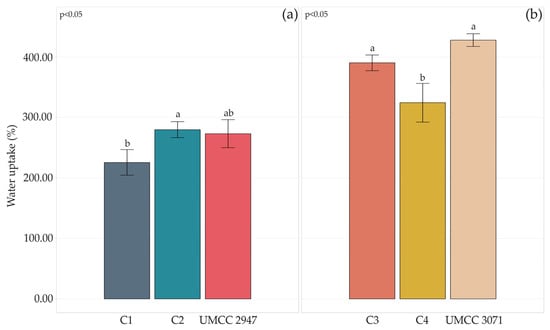 Water uptake percentage after 3 h of pure BC and BC-HA composites produced by UMCC 2947 (a) and UMCC 3071 (b) as monocultures and in combination with LAB. Each color represents a different sample. Bar plots indicate the average water uptake by three replicates ± standard deviation. A significant difference among water uptake is shown by different letters (p ≤ 0.05).