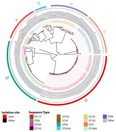 - Beghain, J.; Bridier-Nahmias, A.; Le Nagard, H.; Denamur, E.; Clermont, O. ClermonTyping: An easy-to-use and accurate in silico method for Escherichia genus strain phylotyping. Microb. Genom. 2018, 4, e000192. [Google Scholar] [CrossRef]