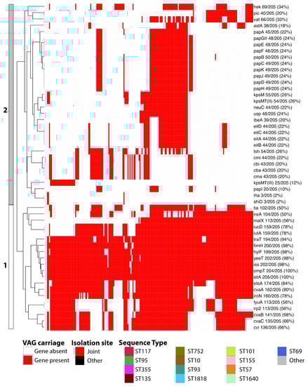 - Maluta, R.P.; Logue, C.M.; Casas, M.R.; Meng, T.; Guastalli, E.A.; Rojas, T.C.; Montelli, A.C.; Sadatsune, T.; de Carvalho Ramos, M.; Nolan, L.K.; et al. Overlapped sequence types (STs) and serogroups of avian pathogenic (APEC) and human extra-intestinal pathogenic (ExPEC) Escherichia coli isolated in Brazil. PLoS ONE 2014, 9, e105016. [Google Scholar] [CrossRef]