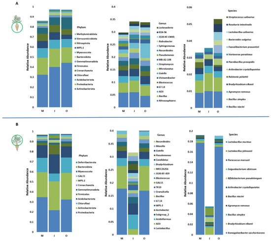 Figure 1. Relative abundance of operative taxonomic units (OTUs) in the microbiome of B. vulgaris obtained by 16S rRNA gene metabarcoding in the rhizosphere (A) and the phyllosphere (B). Only the top taxa with the highest abundance are shown for each sample at 3 different taxonomic levels. OTUs with an abundance greater than 0.05 are shown for phylum, 0.01 for the genus, and 0.02 for species. Different sampling months are indicated with M (May), J (July), and O (October). OTUs denoted with a combination of letters and numbers are candidate taxa that have not been cultured in laboratory conditions.