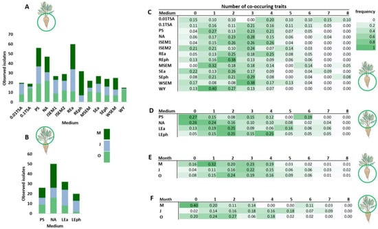 Figure 2. Comparison of different media regarding their effectiveness in isolating strains with plant-beneficial traits. Shown is the number of species isolated on each medium from the root (A) or leaves (B) of the sugar beet collected in May (M), July (J), or October (O). The frequency of isolates showing a certain number of co-occurring traits was calculated from the total number of isolates obtained on different growth media (C,D) or in different months (E,F). The numbers 0 to 8 in (CF) represent the number of co-occurring traits—for example, the number 5 represents all isolates with any combination of 5 out of 8 tested traits. TSA, PS, NA, ISEM, REa, REph, MSEM, SEa, WSEM, WY, LEa, and LEph represent different media used for strain isolation (please see Materials and Methods for a more detailed description of these media).