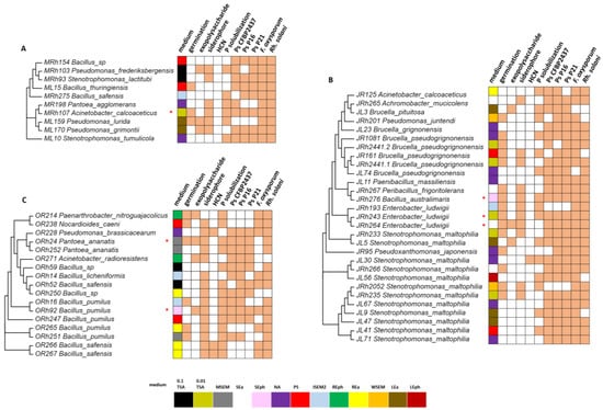 Figure 3. Isolates with five or more co-occurring plant-beneficial traits obtained in May (A), July (B), or October (C). Isolates labeled M (May), J (July), and O (October) represent different months they were sampled, while R represents rhizosphere and L indicates phyllosphere isolates. The different media on which the isolates were obtained are color-coded. A colored square indicates the presence of a plant-promoting trait. * Indicates isolates that have eight co-occurring traits.