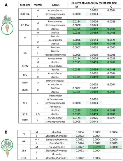 Figure 4. Comparison of the relative frequency of genera determined by metabarcoding with the diversity of genera found on different media. The first column contains media successfully used to isolate plant-beneficial isolates from the rhizosphere (A) and phyllosphere (B). The Genus column lists only those genera that contain isolates with five or more plant-beneficial traits, as determined in Figure 3. Each genus is paired with the medium on which it was detected and the month it was sampled (M—May, J—July, O—October). The heat map shows the relative abundance of each genus as determined by 16S rRNA metabarcoding.