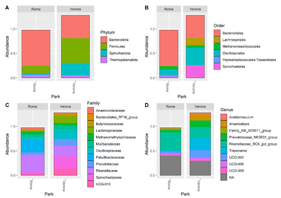 Concerning geographical conditions, the Bioparco of Rome is located in the city, whereas Parco Natura Viva (Verona) is spread over 42 acres of Morainic woodland. Indeed, Rome has different weather from Parco Natura Viva, Verona, with more sun and higher temperatures all through the year. Additionally, the geographical location could be considered an environmental driver of the modulation of microbiota, even if with a minor impact with respect to diet [2].