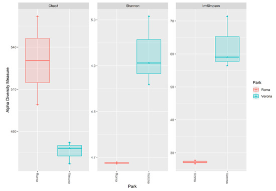 Box plot of the alpha diversity indices (Chao1, Shannon, invSimpson) estimated for the Rome and Verona sites.