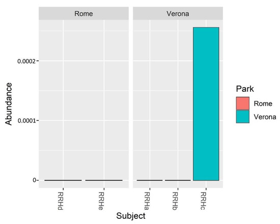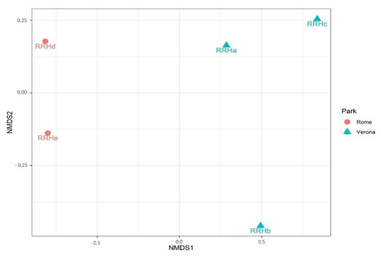 The site of sampling tended to influence the Chao1 (p = 0.075), but significantly influenced the Shannon and InvSimpson diversity indices (p = 0.025; p < 0.01). Rome RRH samples showed a trend for a higher Chao1 index when compared with the Verona RRH samples (Roma = 530, Verona = 466, p = 0.07). However, the Verona RRH samples revealed higher Shannon and InvSipmson indices when compared with the Roma RRH samples (Shannon:Roma = 4.69; Verona = 4.92, p = 0.025; InvSimpson: Roma = 27.2; Verona = 62.3). Regarding the beta diversity, Figure 4 shows the NMDS plot using the Bray–Curtis distance matrix; Rome and Verona RRHs are separated into two distinct clusters. It is interesting to note that sampling sites tended to influence the richness (Chao1, p = 0.075) that is higher in Rome than in Verona. On the contrary, evenness (Shannon: p = 0.025) and diversity (InvSimpson: p = 0.05) were significantly higher in Verona than in Rome. These alpha indices have a different mode of calculation [27,28]; having a higher Chao index and lower Shannon and InvSimpson indices indicate a high richness (especially with rare taxa), but an uneven Rome site compared with the Verona site. Regarding the beta diversity, Figure 4 shows the NMDS plot using the Bray–Curtis distance matrix; Rome and Verona RRHs are separated into two distinct clusters.