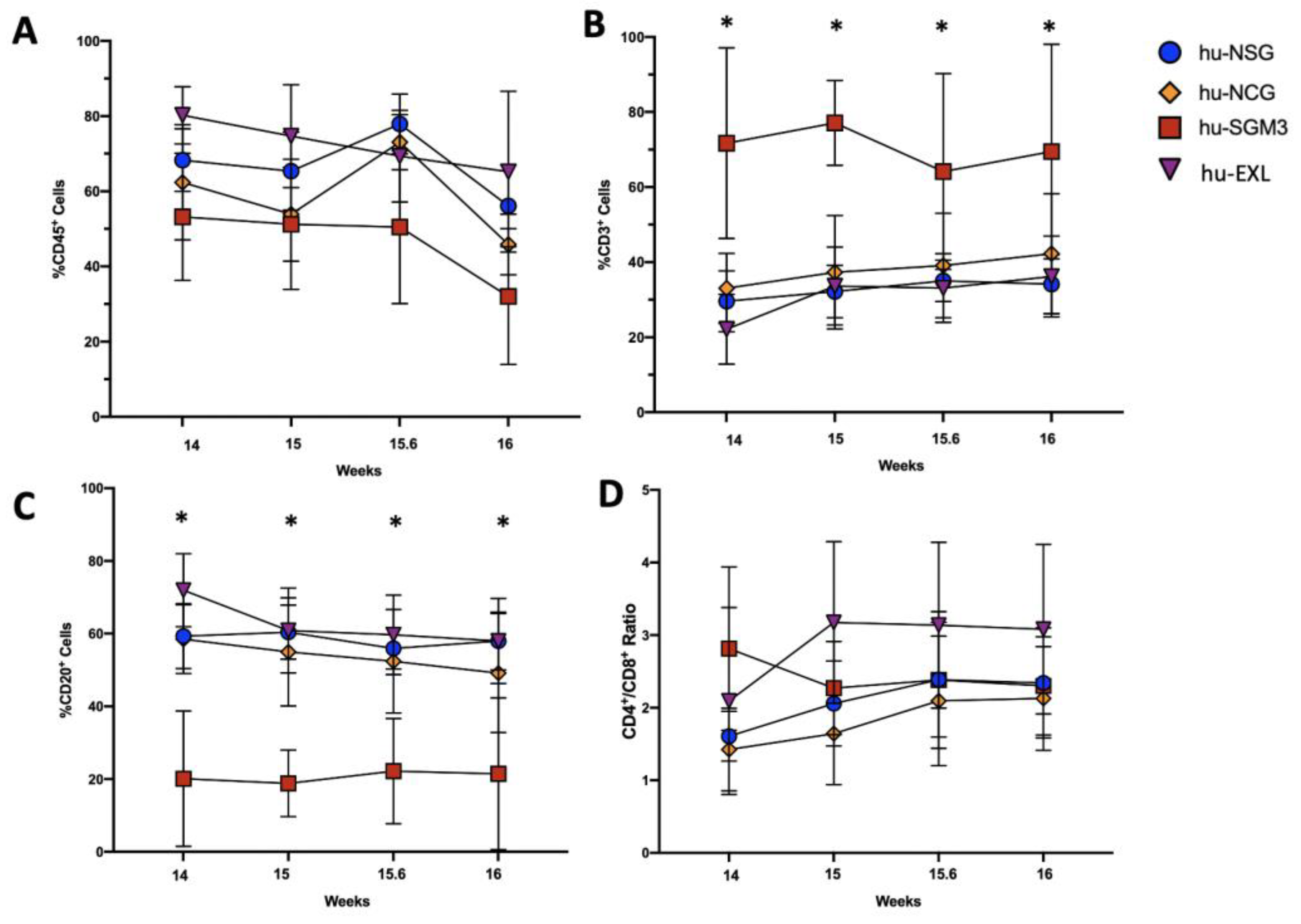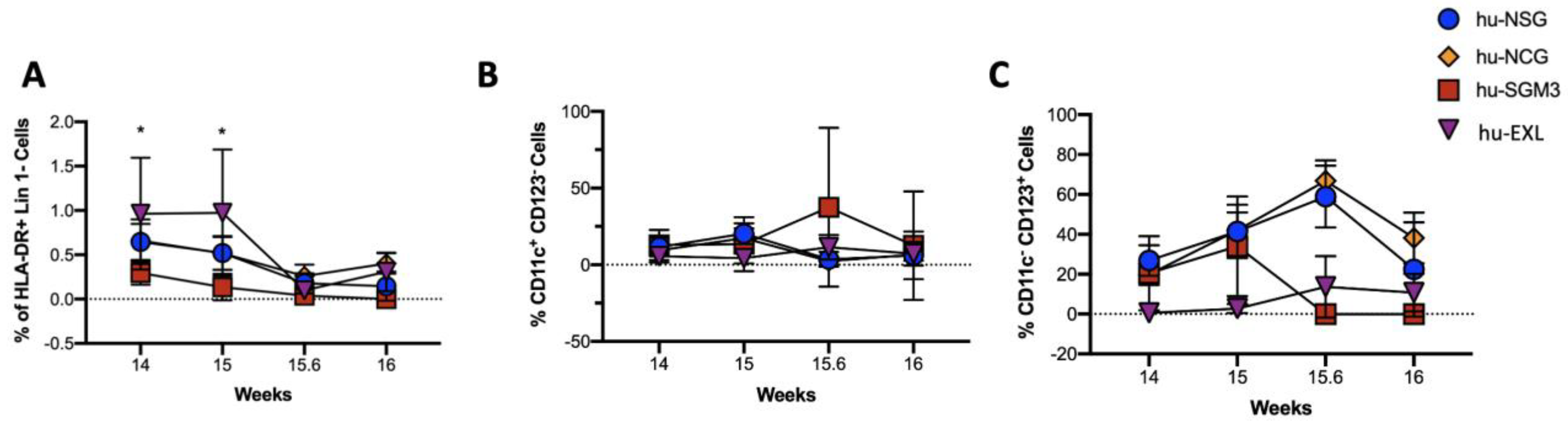 | Cytokine | hu-NSG | hu-NCG | hu-SGM3 | hu-EXL |