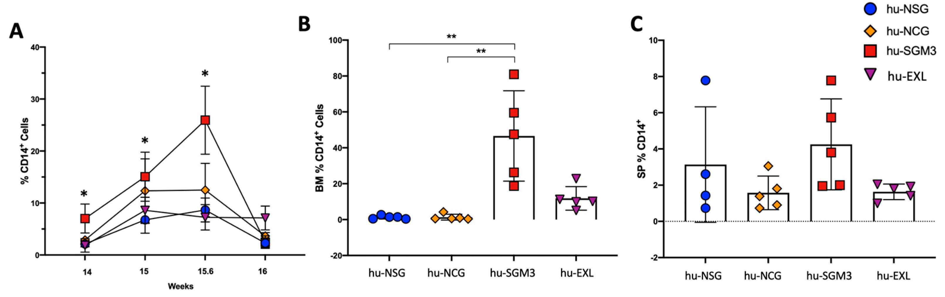 3.2. Increased Frequency of Peripheral CD14+ Monocytes in the hu-SGM3 Model in the Blood and Tissues