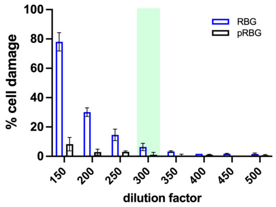 Effect of RBG on vaginal epithelial cells. Cell damage was evaluated by the quantification of lactate dehydrogenase (LDH) release in the culture medium after 24 h of treatment with RBG and pRBG. The graph reports the mean percentage of damage ± SD from triplicate samples of at least 3 different experiments (range dilutions 1:250–1:350) and from triplicate samples of at least 2 different experiments (dilution 1:150; 1:200 and from 1:400).