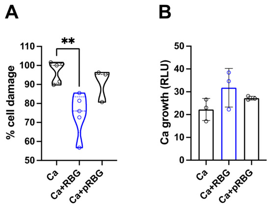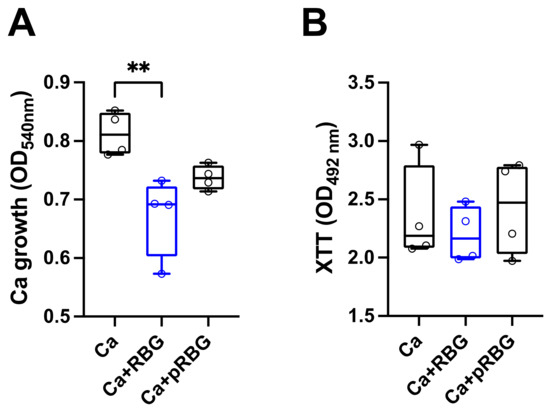 RBG effects on C. albicans growth and metabolic activity: (A) The anti-Candida effect of RBG was analyzed by culturing C. albicans yeast cells in the presence or absence of RBG and pRBG for 24 h. After incubation, absorbance (OD540) was spectrophotometrically quantified. Data in the box plots are from triplicate samples of 4 different experiments. ** p < 0.01 (B) The metabolic activity of C. albicans after 24 h of incubation with RBG and pRBG was analyzed by XTT assay. Data in the box plots are from triplicate samples of 4 different experiments.
