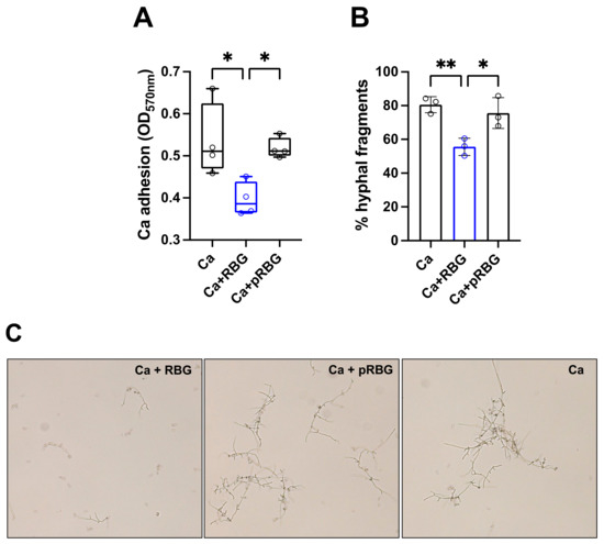 RBG effect on C. albicans adhesion and hyphae formation: (A) Effect of RBG on C. albicans adhesion to abiotic surface after 2 h of incubation at 37 °C in DMEM supplemented with 5% FBS. Data in the box plots are from triplicate samples from 4 different experiments. * p < 0.05 (B) RBG effect on C. albicans hyphal formation after 4 h of incubation at 37 °C in YPD liquid medium + 10% FBS. Data are expressed as the mean percentage of hyphal fragments ± SD from at least 3 analyzed fields for each condition from 3 different experiments. ** p < 0.01, * p < 0.05 (C) Representative fields of RBG or pRBG effect on C. albicans hyphal formation as detailed above. Magnification 20×.