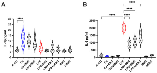 Interleukins production: IL-1β (A) and IL-8 (B) production by vaginal epithelial cells after 24 h of C. albicans (Ca) infection or LPS treatment at 37 °C plus 5% CO2 in the presence or absence of RBG, pRBG and dexamethasone (DEX). Violin plot shows the interleukins amounts released in the culture medium. Data are expressed as pg/mL of duplicate samples from at least 2 different experiments. **** p < 0.0001.