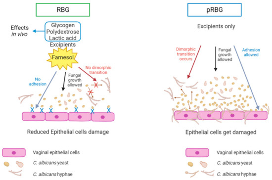 These results expand the data by De Seta and Larsen [41] because RBG has the capacity to impair Candida virulence by counteracting C. albicans-induced vaginal epithelial cell damage. Such effect seems to be achieved through the impairment of specific virulence factors of the fungus, i.e., the reduction in its capacity to adhere and to undergo the yeasts-to-hyphae morphological transition, which are two key factors in fungal pathogenesis. Interestingly, the gel formulations seem not to impair either fungal growth or its metabolic activity. Consequently, the reduced epithelial cell damage exerted by RBG, but not by pRBG, is not achieved through a reduction in the fungal burden. It is our hypothesis that, among the active compounds, the main role may be played by farnesol, which is a well-known QS Candida molecule whose role in promoting yeast morphology has been described [44]. Accordingly, the literature data report that farnesol does not impair Candida growth [22]. The effects of RBG in our experimental system are summarized in Figure 6. This mechanism of action highlights the impact of farnesol without including the role of lactic acid, polydextrose and glycogen. As mentioned above, the effects of such three active components are relevant mainly in vivo.
