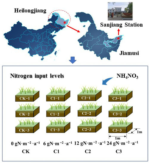 Wetland is a fragile ecosystem. Despite the importance of wetland in supporting a wide range of ecosystem services such as water quality improvement, biodiversity, and climate regulation [1], it has been damaged by natural factors and human activities [2,3,4]. Sanjiang Plain is the largest swamp area in China and is also representative of the global temperate wetland ecosystem. Since the 1950s, as a result of several large-scale agricultural developments, the nutrient input and biodiversity of the wetland ecosystem have greatly changed due to high-intensity drainage and reclamation activities [5,6]. The annual TN loss load of paddy field in Sanjiang Plain is estimated to reach 25.3 kg/hm2, accounting for 15.3% of the total fertilization. Moreover, with the increasing use of fertilization, N leaching is bound to increase in severity, which may result in various potential damages to the ecosystem structure, function, and diversity of wetland [7,8]. Thus, the impact of long-term N input on the health of the entire wetland ecosystem requires an assessment.