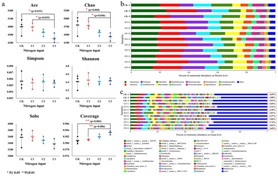 (a) Alpha diversity of soil bacteria. CK: 0 gN·m−2·a−1; C1: 6 gN·m−2·a−1; C2: 12 gN·m−2·a−1; C3: 24 gN·m−2·a−1. Error bars are based on the standard deviation of the means (n = 3). (b) Community composition of soil bacteria at phylum level. Others: relative abundance of bacterial phylum less than 1%. (c) Community composition of soil bacteria at genus level. Others: relative abundance of bacterial genus less than 1%. The numbers are the percentage of unknown microorganisms at genus level.