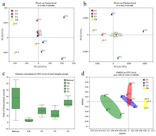 (a) Principal Co-ordinates Analysis (PCoA) of bacterial communities under genus level. (b) Principal Co-ordinates Analysis (PCoA) of bacterial communities under phylum level. (c) Analysis of similarities (ANOSIM) of bacterial communities under OTU level. (d) Non-metric multidimensional scaling (NMDS) of bacterial communities under OTU level. CK: CK−1, CK−2, CK−3, and 0 gN·m−2·a−1; C1: C1−1, C1−2, C1−3, and 6 gN·m−2·a−1; C2: C2−1, C2−2, C2−3, and 12 gN·m−2·a−1; C3: C3−1, C3−2, C3−3, and 24 gN·m−2·a−1.