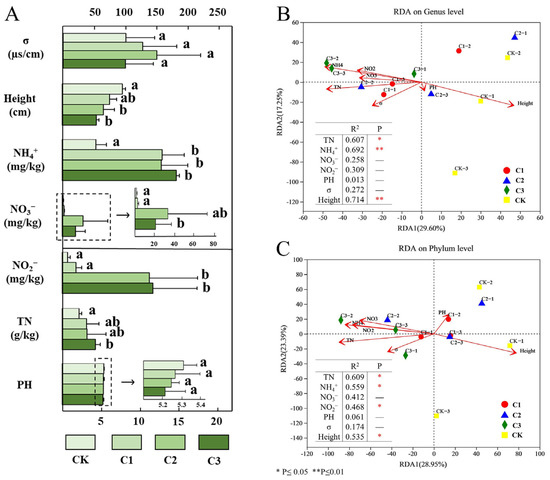 The characteristics of soil pH, TN, NH4+, NO3−, NO2−, σ, and plant height are shown in Figure 4A. The results showed an increase in the content of various N in the soil by N application. Compared with CK, the soil NH4+ content increased significantly in C1, whereas the content of NO2− increased significantly in C2 and increased continuously with increased N addition. Furthermore, the content of TN in C3 was significantly higher than that in CK. The NO3− content increased after C1 and C2 and decreased after C3 treatments. Different from the soil N content, the pH decreased with increased N levels, but the change was not significant. Soil conductivity (σ), which reflects salinity, increased and then decreased, but the differences between treatment groups were not significant. Plant height decreased significantly with increased N input, indicating that N input may also have a stress effect on the plants.