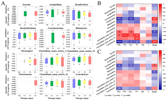 Bacteria involved in the soil effects on N cycling microorganisms and plant pathogenic microorganisms cycle include N-fixing, nitrifying, and denitrifying bacteria. Serratia, Bradyrhizobium, Curtobacterium, Azospirillum, Desulfovibrio, and Rhizobacter are N-fixing bacteria [38,39,40]. Figure 5A demonstrates their relative abundance and absolute numbers with N input. Serratia and Curtobacterium appeared only in C1 and C3, indicating that the addition of N addition the survival of both genera. The relative abundance of Azospirillum and Desulfovibrio showed significant decreases at medium and high levels of N, but no significant changes in the absolute number of bacteria were observed at high N inputs. Bradyrhizobium had the highest abundance and number and did not change significantly under N input, indicating its robustness to N stress. Rhizobacter decreased in abundance and number under N input, but did not change significantly.