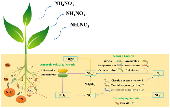 The Nitrobacter detected included Nitrosospira and Nitrosomonas, the main genera of ammonia-oxidizing bacteria in soil [41]. Nitrosospira and Nitrosomonas appeared only with N input, and the abundance and number of Nitrosospira increased with N addition, suggesting that the N addition had a promotive effect on their growth. Clostridium_sensu_stricto_1, Clostridium_sensu_stricto_12, and Clostridium_sensu_stricto_13 are denitrifying bacteria that can convert NO3− to N2 [42,43]. Conexibacter can reduce NO3− to NO2− [44]. The abundance of Clostridium_sensu_stricto_1 showed a significant increase with N addition, but the number did not change significantly. The abundance of Clostridium_sensu_stricto_12, Clostridium_sensu_stricto_13, and Conexibacter was higher and did not change significantly with N addition, indicating that the exogenous N input had less effect on the denitrifying bacteria.