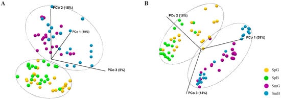 UniFrac Principal Coordinate Analysis (PCoA) plot. PCoA plots depicting the (A) unweighted UniFrac (quantitative) and (B) weighted UniFrac (qualitative) were implemented to illustrate the β-diversity. Each figure indicates the microbiota of chicory leaf samples collected during each season and at each site (SpG; Gongju sample collected in spring, SpB; Busan sample collected in spring, SmG: Gongju sample collected in summer, and SmB; Busan sample collected in summer).