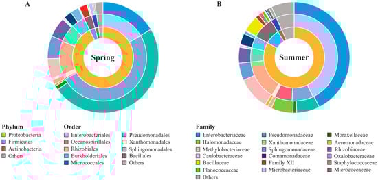 Comparison of microbiota composition at the phylum, order, and family levels in (A) spring and (B) summer. ‘Others’ indicate microbial phyla, order, and families with relative abundance below 2%, 1%, and 0.5% in the sample average, respectively.