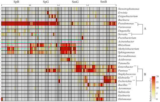 Heatmap analysis was used to compare the microbiota of chicory leaves at the genus level (over an average of 0.5%, Figure 3). Differences in the abundance of some pathogenic genera are shown in the three groups. Methylobacterium (5.92 ± 5.69% in spring and 9.57 ± 14.32% in summer), Sphingomonas (6.69 ± 5.03% in spring and 4.90 ± 7.37% in summer), and Rhizobium (5.77 ± 6.76% in spring and 4.53 ± 6.60% in summer) were dominant genera in both sampling times. These genera are widely distributed in the environment, such as soil and water, and have a wide range of growth temperatures []. Pseudomonas and Serratia in spring (48.90 ± 22.72% and 2.96 ± 3.91%) were significantly higher than in the summer samples (6.81 ± 6.40% and 0.57 ± 0.95%, A group). Some species of Pseudomonas and Serratia have been reported to survive at low temperatures through physiological changes that neutralize the problems caused by low temperatures [,,]. Moreover, these species are related to food-borne pathogens and spoilage bacteria, such as P. aeruginosa, P. fluorescens, and S. marcescens. Pantoea, Enterobacter, Escherichia, Bacillus, and Klebsiella in spring (5.78 ± 7.85%, 1.02 ± 1.29%, 0.01 ± 0.001%, 0.09 ± 0.11%, and 0.00 ± 0.00%) were significantly lower than that in the summer samples (14.33 ± 14.21%, 10.54 ± 10.40%, 7.27 ± 11.80%, 4.13 ± 7.16%, and 4.13 ± 6.05%, B group). The genera Pantoea, Enterobacter, Escherichia, and Klebsiella in the Enterobacteriaceae family are found in various environments, such as soil, water, animals, plants, insects, and humans []. The genus Bacillus is widely distributed in soil and water []. These dominant genera appeared to be the endogenous microbiota in chicory leaves derived from the soil and water. These are the indigenous microbiota of chicory leaves containing various potential food-borne pathogens, such as P. agglomerans, E. sakazakii, E. coli, K. pneumoniae, and B. cereus, which are closely related to food-borne illnesses. These potentially pathogenic genera cause food-borne illnesses because of their dominance in the production and distribution processes. Therefore, care should be taken to prevent food-borne illnesses caused by chicory leaf microbiota during the production and distribution processes, regardless of the sampling conditions.