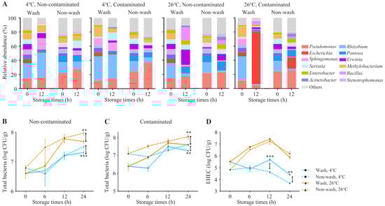 Although higher temperatures significantly influenced the change in the microbiota structure of chicory leaves, obvious effects on the microbiota due to washing and EHEC contamination were observed (Figure 4A). The abundance of several genera, such as Bacillus, Enterobacter, Escherichia, Erwinia, Methylobacterium, Pseudomonas, Rhizobium, Sphingomonas, and Stenotrophomonas, was significantly influenced by these factors. Among them, the abundance of Escherichia was 5.75 ± 2.22% at 0 h, but it increased to 74.25 ± 6.29% (highest abundance among all samples) when the contaminated chicory leaves were stored at 26 °C after washing treatment. The microbiota composition of fresh produce can be changed in response to various postharvest management practices. In a previous study, distinct changes in the microbiota structure of fresh produce were attributed to sanitation practices in unwashed and washed samples []. In our results, the pathogenic Escherichia genus within the chicory leaves microbiota showed a significant increase when samples were washed and stored at 26 °C. This seems to have occurred as particular microorganisms, after washing, destroyed the microbiota structure, grew rapidly at 26 °C, and became dominant.