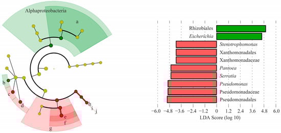 Taken together, the effect of the washing treatment and storage at 4 °C on microbiota structure was evident. Therefore, using LEfSe analysis, we identified a shift in the indigenous microbiota due to storage conditions without artificial contamination (Figure 5). In general, a higher absolute LDA value indicated that the species were more enriched in the group []. We found that Pantoea (c), Serratia (d), Pseudomonas (e; affiliated to the Pseudomonadaceae family within the Pseudomonadales order), and Stenotrophomonas (h; affiliated to the Xanthomonadaceae family within the Xanthomonadales order) at the genus level were significantly enriched in the unwashed group stored at 4 °C (LDA score ≥ 4.0; p < 0.05). However, Rhizobiales at the order level (a) and Escherichia at the genus level (b) were significantly enriched in the washed group stored at 4 °C with LDA scores of 5.00 and 4.59 (p < 0.05). This suggests that the washing treatment may disrupt the indigenous microbiota on chicory leaves, allowing the contaminated EHEC to colonize better and survive at low temperatures.