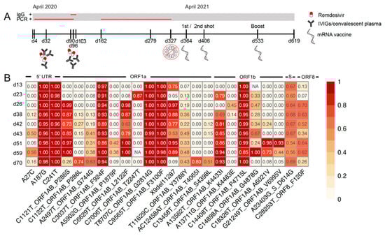 Clinical course and SARS-CoV-2 genome sequencing. (A) Overview of the clinical and virological course of COVID-19 in an immunocompromised individual. (B) Heatmap showing the longitudinal development of all SARS-CoV-2 variants identified via whole-genome sequencing at a frequency of >40% in at least one of the patient’s nasopharyngeal swab samples. Earliest samples are displayed at the top, with the latest at the bottom. Colour intensities represent variant frequencies from 0 to 1. IVIGs = intravenous immunoglobulins, NA = not available (i.e., no confident variant calls at this position), d = days after infection, UTR = untranslated region, ORF = open reading frame, S = spike gene.