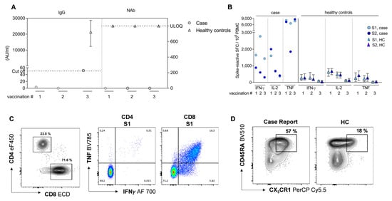 Characterization of SARS-CoV-2-specific humoral and cellular immunity after SARS-CoV-2 infection and BNT162b2 mRNA vaccinations. (A) Anti-SARS-CoV-2 IgG levels and virus-neutralization activity (NAb) (case values represented as circles, HC median values represented as triangles with interquartile range). (B) Frequencies of SARS-CoV-2 spike-reactive IFN-γ-, IL-2-, and TNF-secreting cells (case, circle) upon re-stimulation of PBMCs with spike S1 (light blue) and S2 (dark blue) peptide pools, as compared to a vaccinated control group (HC, triangle; vaccination #1, n = 50; vaccination #2, n = 20; vaccination #3, n = 9) of non-immunocompromised convalescents with SARS-CoV-2 infection (median with interquartile range shown for HC). (A,B) Vaccination #1 = 14 days post-1st-COVID-19-vaccination, vaccination #2 = 14 days post-2nd-vaccination, vaccination #3 = 3 months (case) or 14 days (HC) post-3rd-vaccination. (C) Frequencies of CD4+ and CD8+ T-cells (left panel) and spike S1-reactive IFN-γ- and TNF-producing CD4+ and CD8+ T-cells (right panel), directly determined ex vivo three months after 3rd vaccination via flow cytometry using intracellular cytokine staining. (D) Phenotypic characterization via flow cytometry demonstrates increased expression of CX3CR1 on CD45RA+ CD8 T-cells, relative to a representative HC subject. Representative plots depict total CD8 T-cells. ULOQ = upper limit of quantification. SFC = spot-forming cells. HC data partially published in [8].