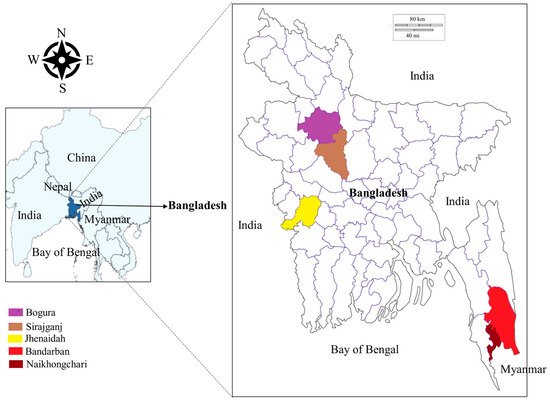Approval for animal sampling was obtained from the Department of Livestock Services (DLS), Ministry of Fisheries and Livestock, Government of the People’s Republic of Bangladesh. Verbal consent was attained from the animals’ owners through providing them with detailed study objectives. Blood samples were collected by registered veterinarians through proper restraining to avoid any injury to the animals. Moreover, the ethical guidelines for the use of animal samples approved by Obihiro University of Agriculture and Veterinary Medicine, Obihiro, Hokkaido 080-8555, Japan (Animal experiment approval ID number: 22-23) were followed during sample collection.