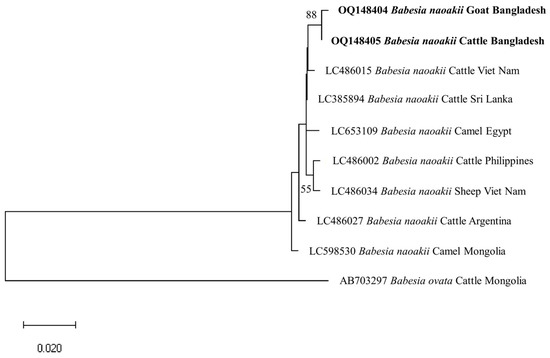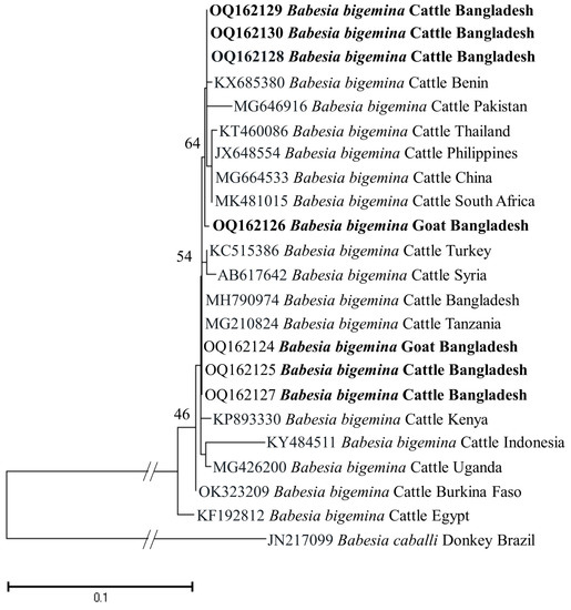 Phylogenetic analyses of the sequences of B. bigemina (BbigRAP-1a), B. bovis (BboSBP-4), B. naoakii (AMA-1), B. ovis (ssu rRNA), T. annulata (Tams-1) and T. orientalis (MPSP) were conducted by the maximum likelihood (ML) method using MEGA XI [35]. The ML method was used to select the best nucleotide substitution model based on a Bayesian information criterion for ML analyses, and the phylogeny test was carried out by the bootstrap method with 1000 replications.