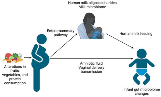 Schematic of the pathways by which maternal nutrition influences the infant gut microbiome. Figure created using Biorender.com, accessed on 31 March 2023.