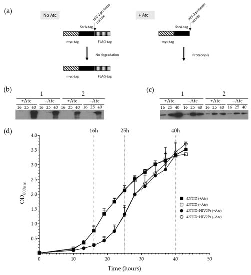 Growth analysis of MSMEG_4272 knock-down strain. (a) MSMEG_4272-ID fusion protein is stable in the absence of HIV-2 protease. In the presence of HIV-2 protease, the protecting peptide is removed and protein degraded through proteolysis. The MSMEG_4272 protein levels were analysed by western blotting using (b) anti-FLAG to evaluate ssrA-tag exposure and (c) anti-myc antibodies to determine protein degradation. Aliquots from (1) 4272ID and (2) 4272ID::HIV2Pr, with and without Atc, were taken after 16 h, 25 h, and 40 h of growth (dot-dash lines). Protein quantity for western blotting analysis was standardized by protein concentration using the Bradford assay. (d) Growth monitored over 43 h for the M. smegmatis strains: 4272ID and 4272ID::HIV2Pr with (open square and circle) and without (solid square and circle) the addition of Atc, respectively. Values represent the mean, and error bars represent standard deviation for three independent experiments.