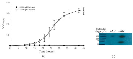 To further characterize these strains, we grew them in the absence of Atc for 15 h and then induced transcriptional silencing. At 9 h following Atc addition, the 4272ID::sgRNA strain displayed a reduced growth rate relative to the other strains, confirming that the protein is required for normal growth under standard conditions (Figure 3). When comparing the Hill-slope (i.e., change of OD over time during exponential growth) of strains cultured in the presence and absence of Atc, a significant difference was observed for both WT::sgRNA (p = 0.005) and 4272ID::sgRNA (p = 0.001), suggesting a change in the growth rate, although the difference in OD values at each time point for the WT::sgRNA strain was marginal.