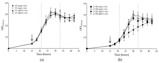 Generating a MSMEG_4272-deficient strain using the CRISPRi system was more successful than the protein depletion approach. RT-qPCR revealed that the CRISPRi system achieved a log2 fold-change of 2.85 in WT::sgRNA and 2.53 in 4272ID::sgRNA after 6 h of sgRNA induction (Figure 4), with similar levels measured after 18 h of induction. Previous reports, investigating the relationship between transcriptional repression and the resulting phenotypic effect, used the same sgRNA sequence and observed a log2 fold-change of 2.97, consistent with our findings [,]. Furthermore, a vulnerability index of −1.33 was observed for MSMSEG_4272, suggesting that a high level of inhibition is required before a growth defect is observed []. We hypothesize that the phenotypic differences between the 4272ID::sgRNA strain and the WT::sgRNA strain are due to either decreased functionality or decreased stability of the ID-tag fusion protein, which further decreases the amount of functional MSMEG_4272 protein in the 4272ID::sgRNA strain. Furthermore, the growth defect of the 4272ID::sgRNA strain was most prominent between 25 and 35 h, with the OD reaching the same level as the uninduced strain by 38 h. This may point to a higher demand for MSMEG_4272 during exponential growth, which cannot be achieved in the 4272ID::sgRNA strain. The observation that transcriptional repression in the 4272ID::sgRNA strain is comparable after 21 and 33 h of growth suggests this recovery is not due to increased expression but rather due to decreased demand for the protein as the culture enters stationary phase. Previous studies have shown that certain A-type carrier proteins are only required under specific conditions [], such as oxidative stress. Therefore, MSMEG_4272 may be important during exponential growth when Fe-S cluster demand is high.