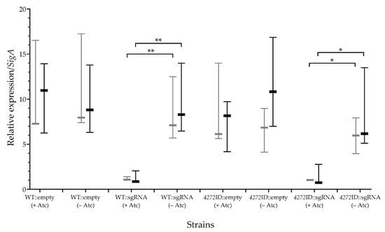 To verify transcriptional silencing of MSMEG_4272, transcript levels were determined at 6 (exponential phase) and 18 h (stationary phase) after the addition of Atc (Figure 4). The WT::sgRNA and 4272ID::sgRNA strains grown in the presence of Atc showed a reduction in MSMEG_4272 expression relative to no Atc controls log2 fold change of 2.85 (±0.09) in WT::sgRNA and 2.53 (±0.03) in 4272ID::sgRNA). This data also confirms that the phenotypic differences observed between WT::sgRNA and 4272ID::sgRNA are not due to differences in transcriptional silencing.